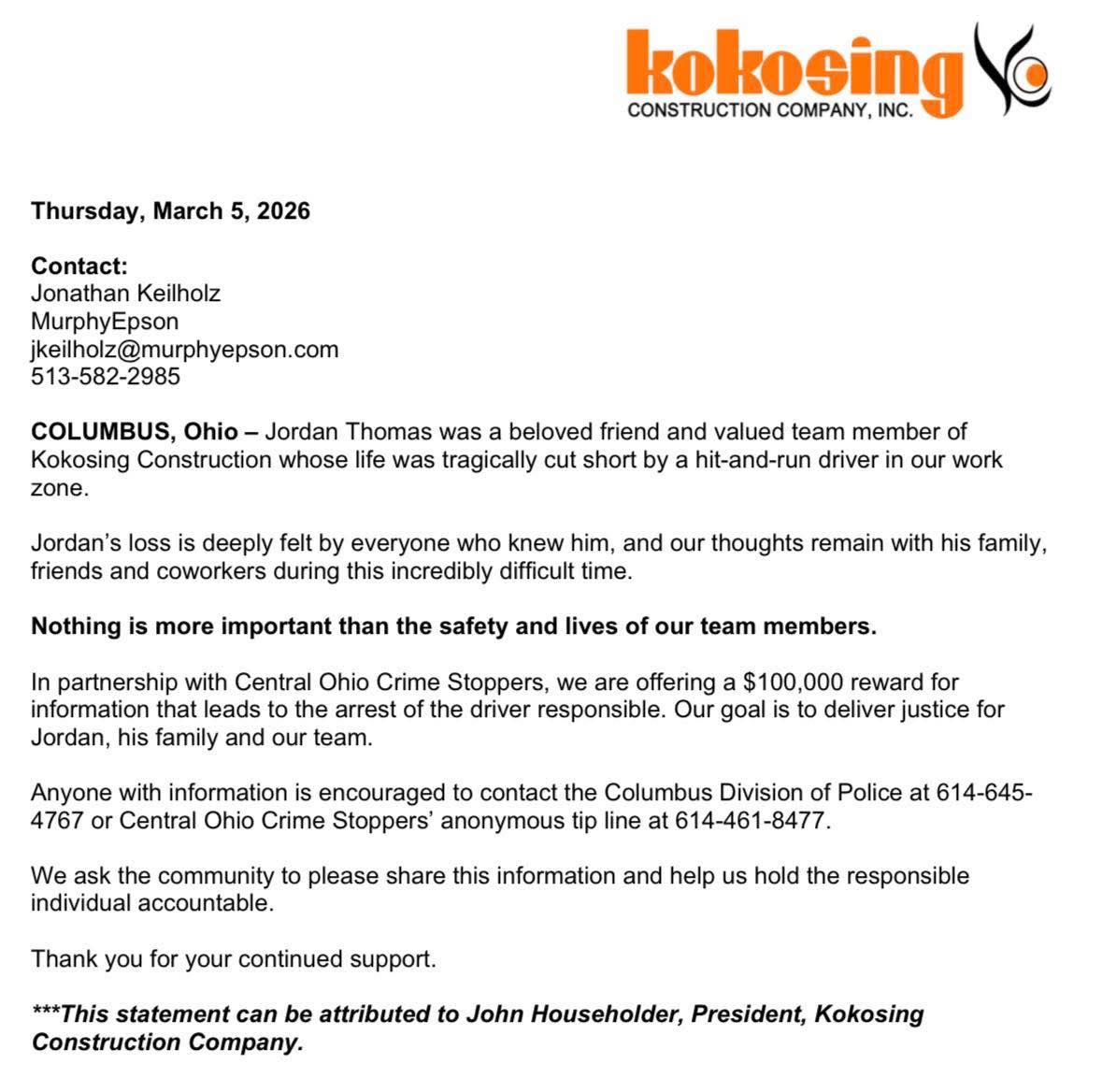 Kokosing Construction in partnership with Central Ohio Crime Stoppers, announced the $100,000 reward for any information that leads to the identification and arrest of the individual responsible.