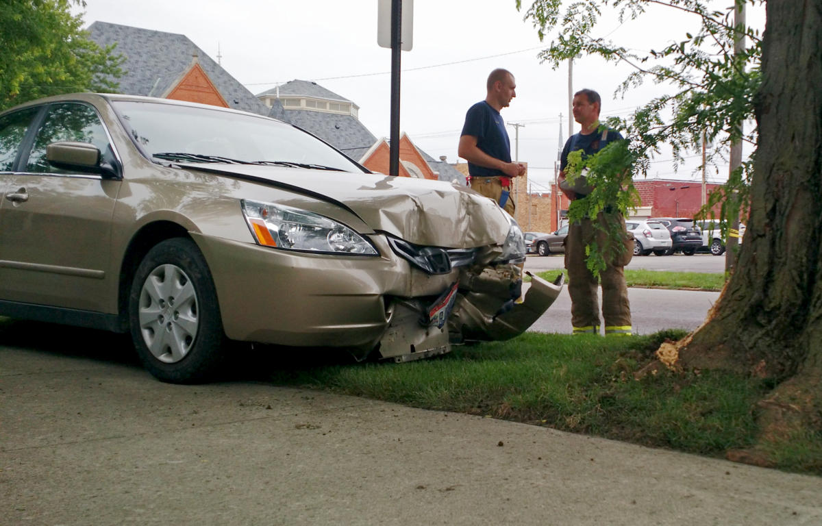 Bucyrus police officers and firefighters responded to an accident around noon Friday after a car crashed into a tree in front of the Bucyrus Historical Society. Police report that an elderly woman was pulling out of the parking lot across the street and intending to head northbound on South Walnut Street. Concerned that she would hit another motorist coming northbound on the street, officers said the woman gassed her car. Her vehicle went over the curb, onto the lawn, and hit the tree.
