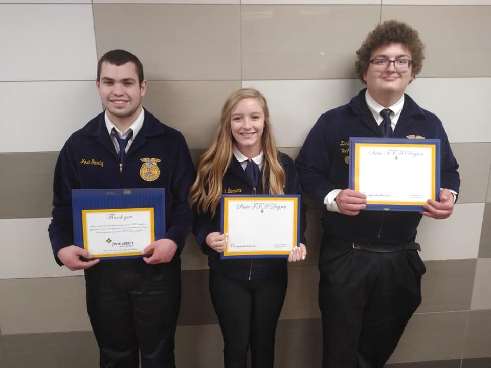 Friday evening concluded with the awarding of the Ohio FFA State Degrees. The state degree is the highest award that the Ohio FFA Association can bestow upon its members. This year receiving the award was seniors Josh Gwirtz and Zach Hiler, and junior Savannah Barnette.