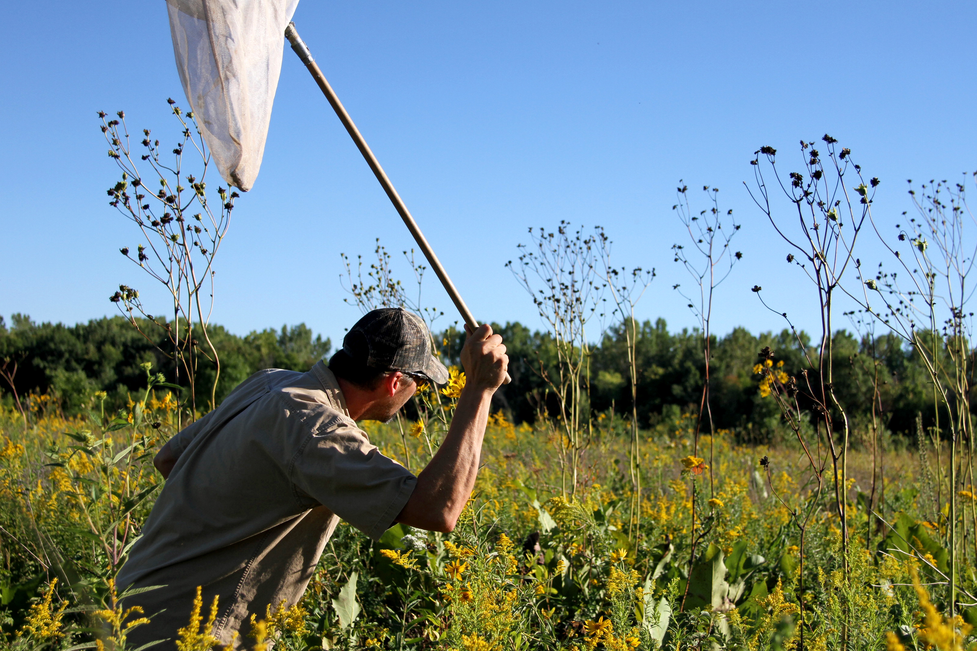 Photos of Crawford Park District Naturalist Josh Dyer teaching the difference between male and female monarch butterflies and how to properly tag a monarch.