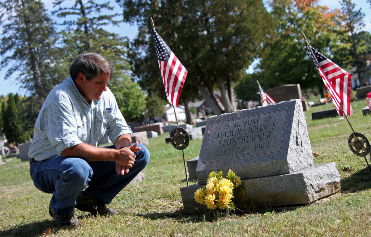 At a headstone flanked by American flags and a Vietnam conflict emblem, Karl Stoneburner Hook crouched beside his father’s memorial. Situated just behind a large headstone that marked the graves of Henrietta Stoneburner, E. Lester Stoneburner, Earl R. Stoneburner, and William N. Stoneburner, a memorial for Major John F. Stoneburner sat.