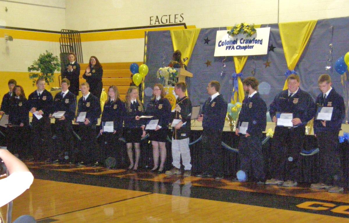 Family and friends of the Colonel Crawford/Pioneer FFA Chapter were present to honor the accomplishments of the Colonel Crawford FFA students during their banquet and awards night on Tuesday, April 8. Our featured Speaker was Miss Hallie Sue Heiser from Greenview FFA serving as an Ohio FFA Association officer. Before the awards program, there was a dinner featuring Apple Bourbon Chicken, Marsala Steak Medallions, Stuffed Alfredo Pasta Shells, Garlic Herb Mashed Potatoes, Corn Casserole, Salad, Rolls, Chocolate River, and Cake for dessert. Thank you to Norton’s for donating the flowers and helium for the balloons. Also a special thanks to Special Occasions Catering for the great food and service. Thank you to all the people that donated items for the occasion. It was greatly appreciated.