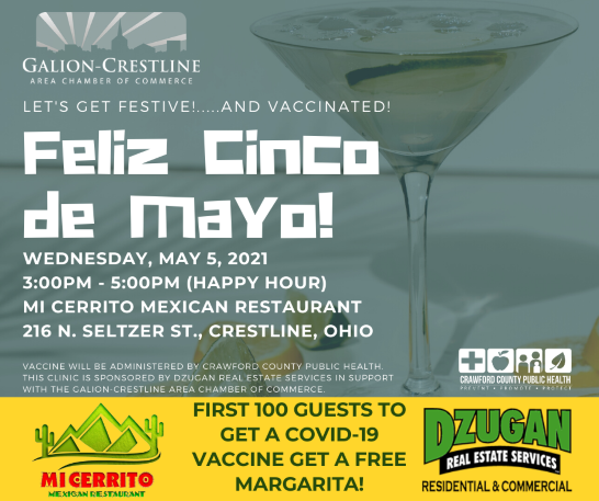 Crawford County Public Health is offering this free walk-in COVID-19 vaccine clinic for those age 18 and older at Mi Cerrito Mexican Restaurant in Crestline, Ohio on May 5, 2021, from 3:00 pm – 5:00 pm during Happy Hour, or while supplies last. The first 100 people that are age 21 and older that get vaccinated during the clinic will be provided with a Mi Cerrito coupon for a free margarita that night, sponsored by Dzugan Real Estate Services.