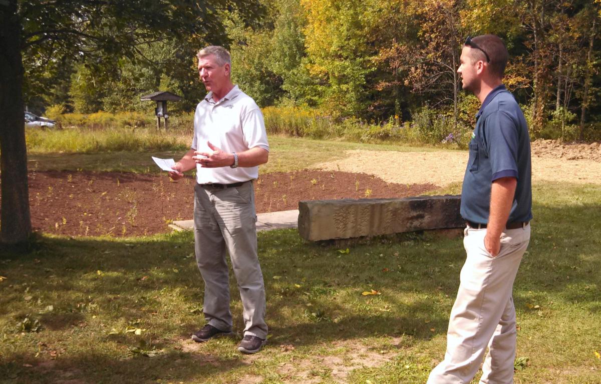 The Park District received a $65,030 Ohio EPA Surface Water Improvement Fund grant in order to implement a storm water and nutrient reduction demonstration project at Lowe-Volk Park Nature Center. Fisher, Oberlander’s landscape manager John Monnette, and Oberfield’s Tom Boren proudly showed off the newest additions to the Park District Friday afternoon.