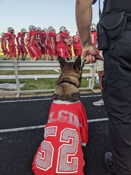 MARION—Deputy Sam Staley and his partner K9 Comet were introduced to the Elgin community Friday night before their football game against Galion. Comet was purchased, in part, through funds that were raised by the students of Elgin Local Schools in Marion.