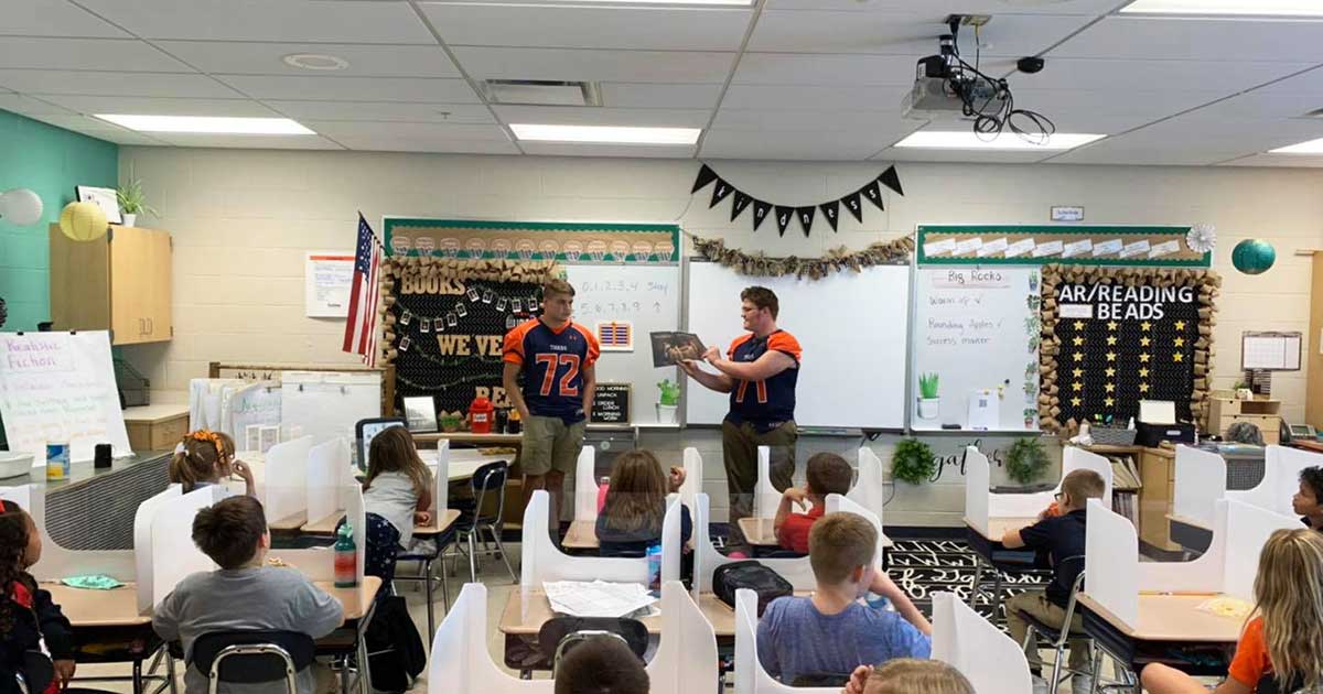 The players have been reading to Primary and Intermediate students for the past six years. While the entire football team participates in the program, only four to six players go each week.
