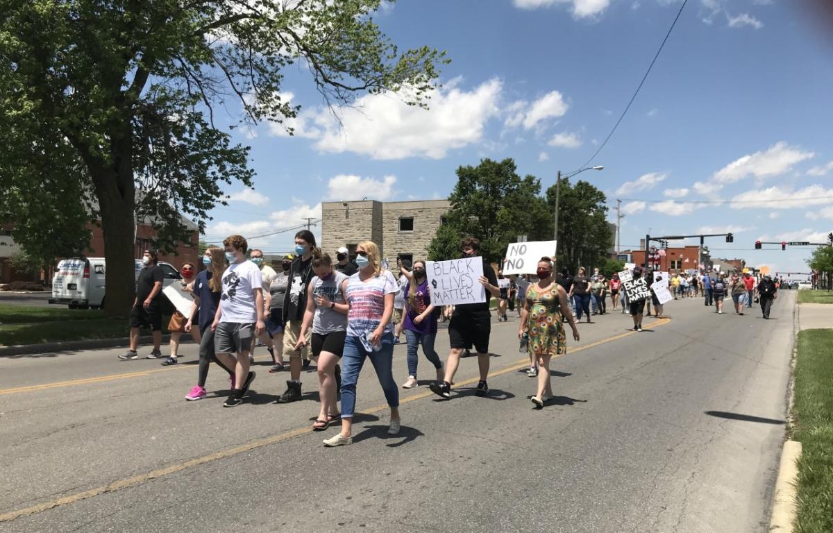 BUCYRUS — A crowd of protesters marched up and down Sandusky Avenue in downtown Bucyrus in a demonstration against police brutality and racial injustice.