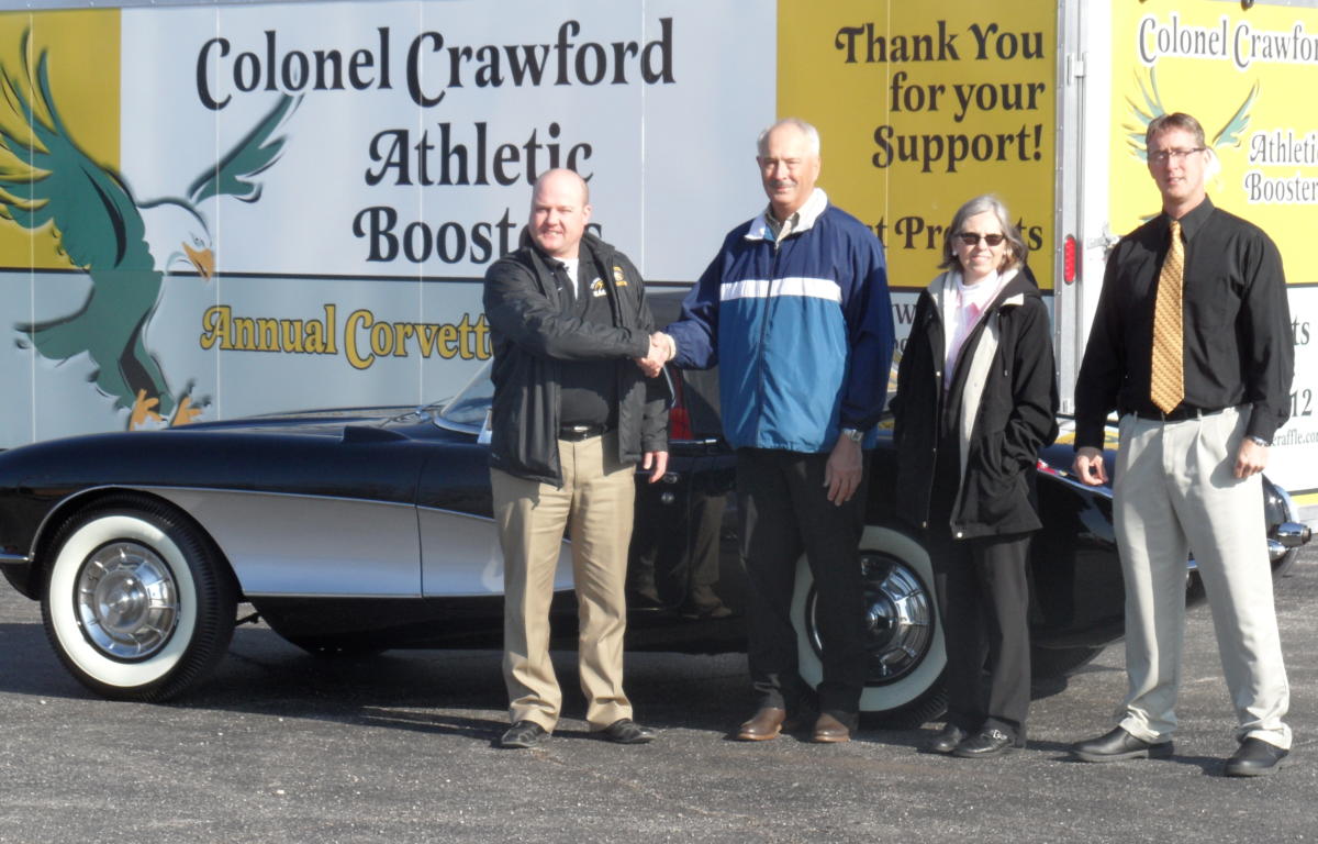 A Michigan couple was only too happy to venture in Ohio and Crawford County on Friday even if it meant their return was in separate cars. Brian and Billie Briegel of Tekorsha, Michigan, were at Colonel Crawford to pick their grand prize for winning the Colonel Crawford Athletic Boosters Corvette Raffle – a 1956 black and silver convertible Corvette.