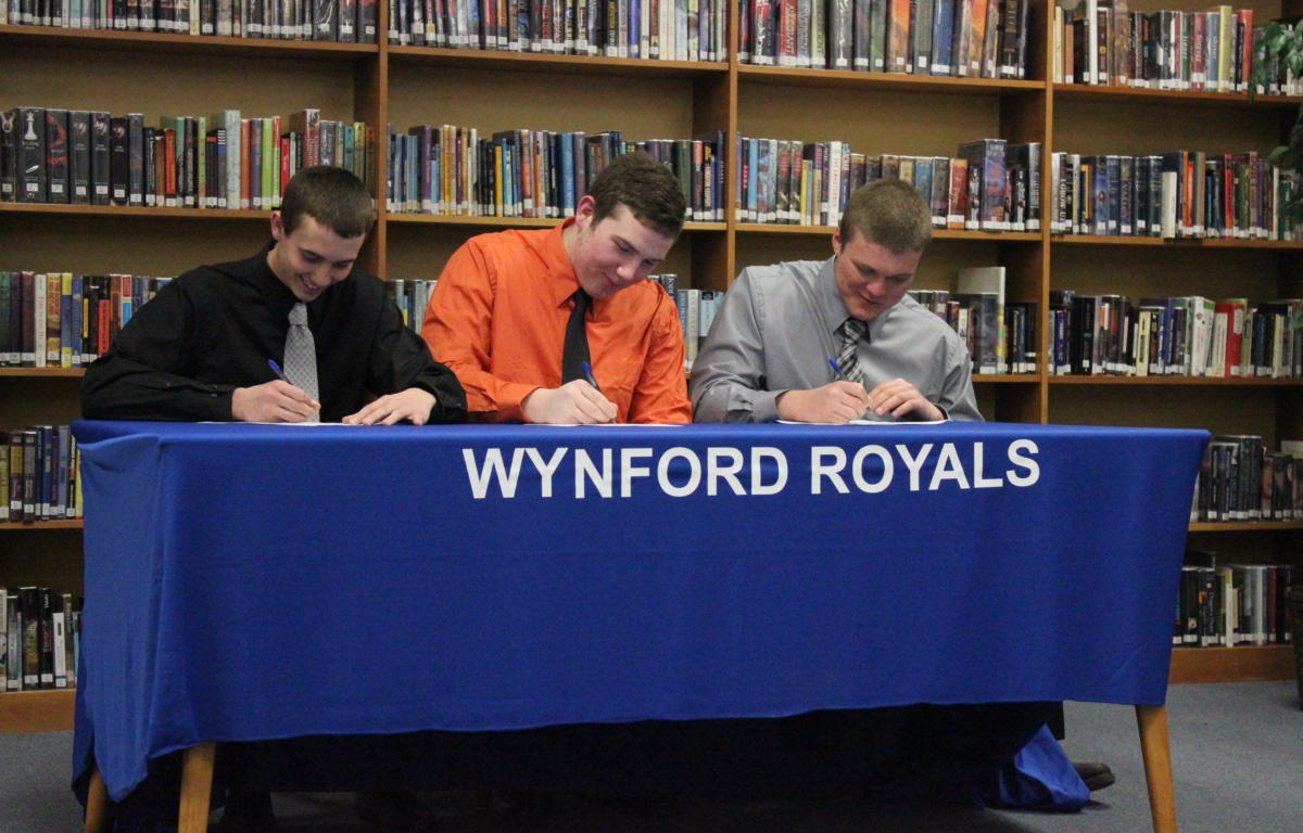 Three Wynford seniors will be trading in their royal blue for the orange and black of the University of Findlay after signing their letters of intent Wednesday.