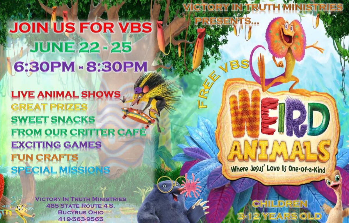 Victory in Truth Ministries vacation Bible school “Weird Animals” will take place June 22-25 from 6:30 p.m. to 8:30 p.m. nightly! This is for all potty trained 3-year-olds through 12-year-olds. Vacation bible school is free.
