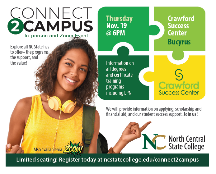 North Central State College is your community’s state two-year college! Visit us online or in-person at the Crawford Success Center located in Bucyrus Ohio. You can also participate in Virtual Admission Sessions or participate in the “Connect 2 Campus” in-person and Zoom event set for November 19. For details contact us at 419 755-9039. Reminder to apply today for a Crawford County Scholarship.