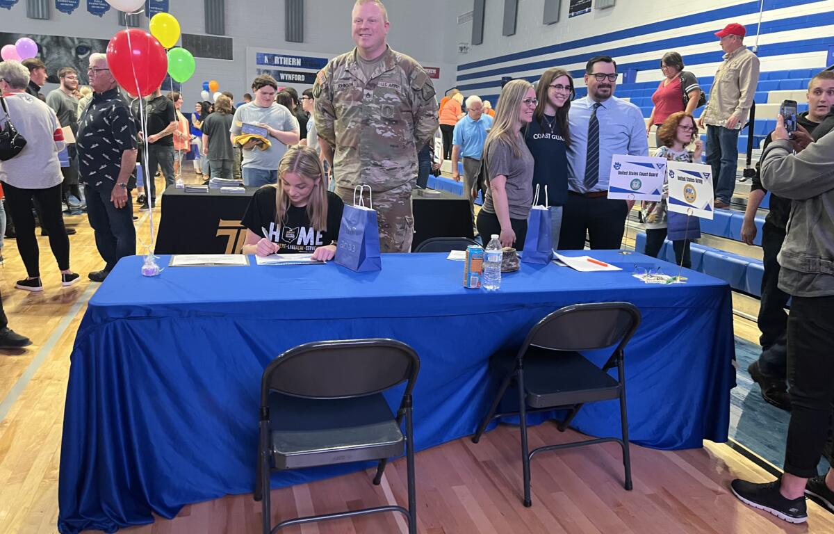 “I’ve had signing days at two of the previous districts I worked in as High School Principal. Marion Harding and Tiffin Columbian both had them where I was principal. It’s something that I learned from Gary Barber, the Superintendent I worked for at both stops,” Superintendent Forrest Trisler said. “Signing Day is awesome! It’s a way to show your community and stakeholders that our seniors are ready for graduation. They have gained acceptance to a 2 or 4-year college, an apprenticeship or career/technical education, or have enlisted in the US Armed Forces or have been accepted to employment in a high quality, in-demand job. High School Principal Julie Miller, and High School Counselor, Shelli Ashley, led putting our signing day together, enlisting tech help from Dustin Tesso and Nicole Pelter and the voice of Wynford, Mr. Jason Chandler! They all did a fantastic job making this a very special day for our seniors and the community.”
