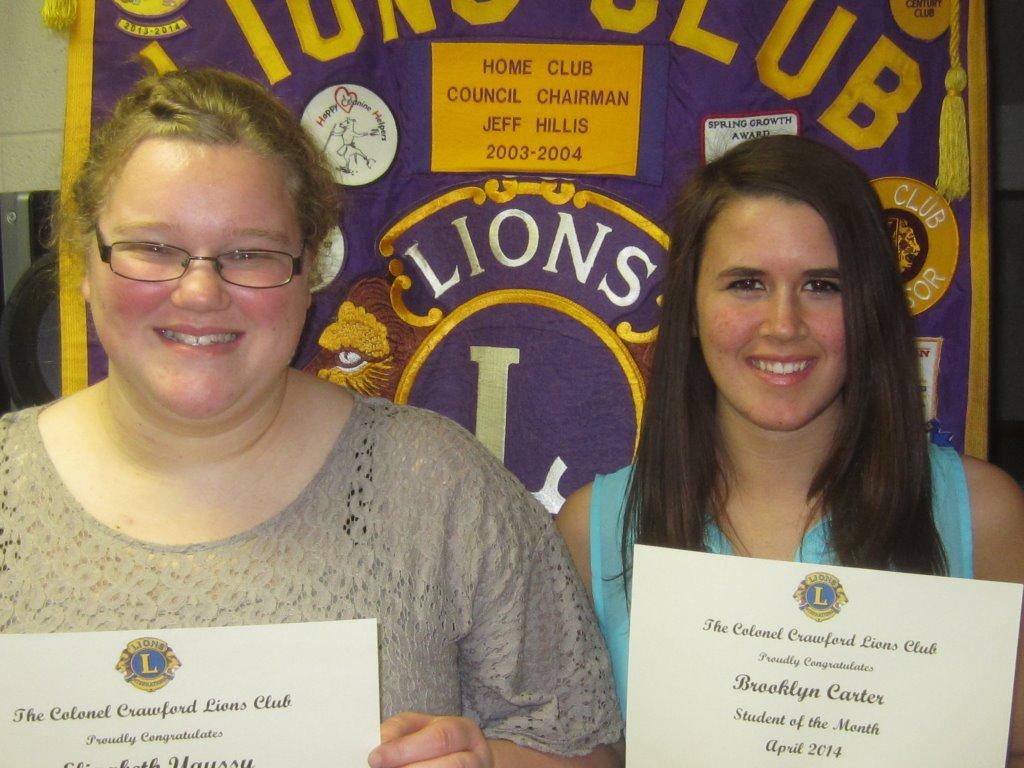 Both honorees and family members were guests of the Col. Crawford Lions at the April dinner meeting. Each Student of the Month received a commemorative certificate and a check for fifty dollars.